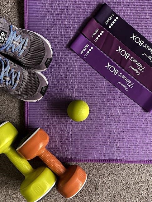 A vital component of the 5-day dumbbell workout PDF is the cool-down and stretching phase. Static stretches, held for 30 seconds, improve flexibility and reduce muscle soreness. Focus on major muscle groups worked during each session. The PDF often includes specific stretches for chest, back, legs, and core. Proper cool-down aids recovery, prevents injury, and enhances long-term progress. Don’t skip this step; it’s as important as the workout itself for optimal results and well-being.
