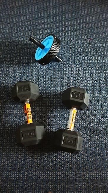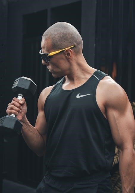 The 5-day dumbbell workout PDF emphasizes glute activation for a well-rounded lower body routine. Dumbbell hip thrusts are crucial for glute development, offering a targeted approach. Single-leg deadlifts with dumbbells improve balance and isolate each glute. Walking lunges, holding dumbbells, further enhance glute engagement. These exercises, often detailed with form cues in the PDF, build strength and shape the glutes effectively, contributing to improved posture and athletic performance.